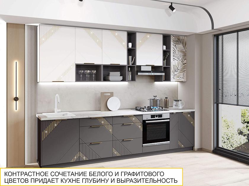 Коллекция «Монако» — это образец элегантного стиля и утонченного вкуса. Эффектная фрезеровка с объемным 3D-рисунком и россыпью глиттера подчеркивает эксклюзивный и уникальный вид изделия. Цвет верхних фасадов «Альпийский белый» визуально увеличивает пространство, делая его более светлым и воздушным. Он идеально сочетается с тёмными фасадами нижних шкафов, создавая эффектный контраст.