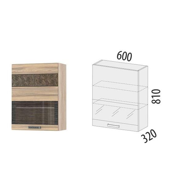Оригинальные ручки подчеркивают современный дизайн. Шкаф комплектуется одной полкой из ЛДСП и двумя сетками: для тарелок и плоской сеткой для стаканов.