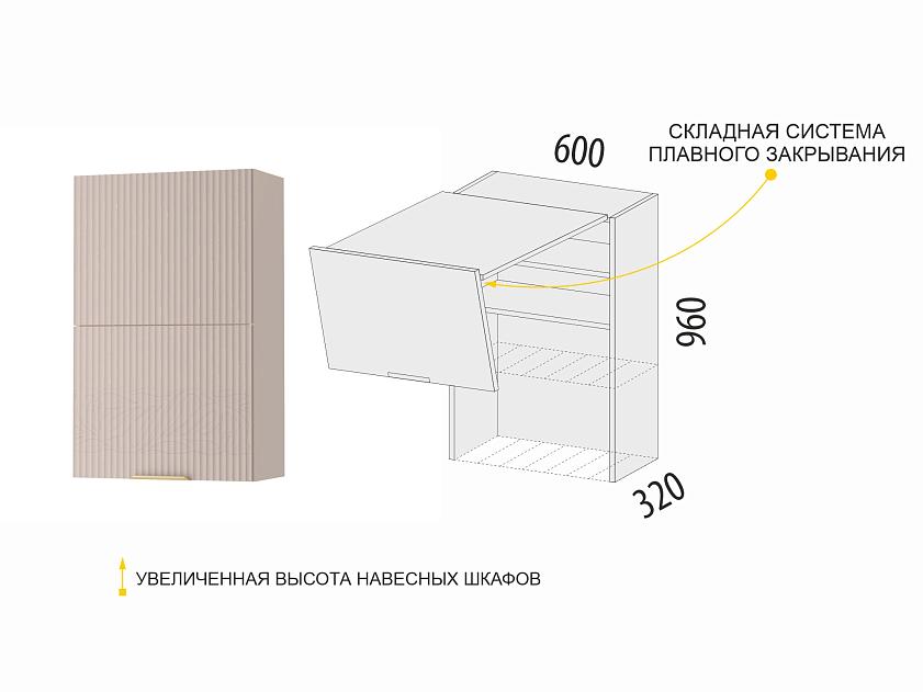 Увеличенная высота навесных шкафов до 96 см создает впечатление большего объема и высоты кухни, делая помещение более просторным и светлым.