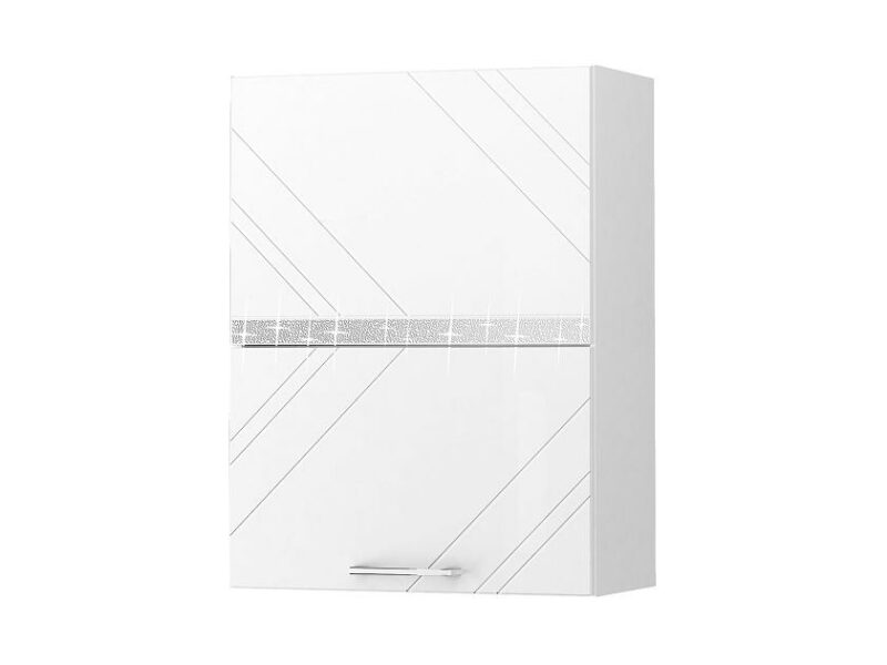 Привычная строгая геометрия глянцевого кухонного фасада дополнена нежным 3D-декором в серебре.