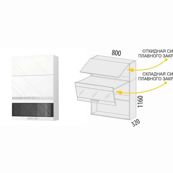 Дверцы шкафа оснащены подъемным механизмом со складной системой, который позволяет легким движением открыть сразу две дверцы.