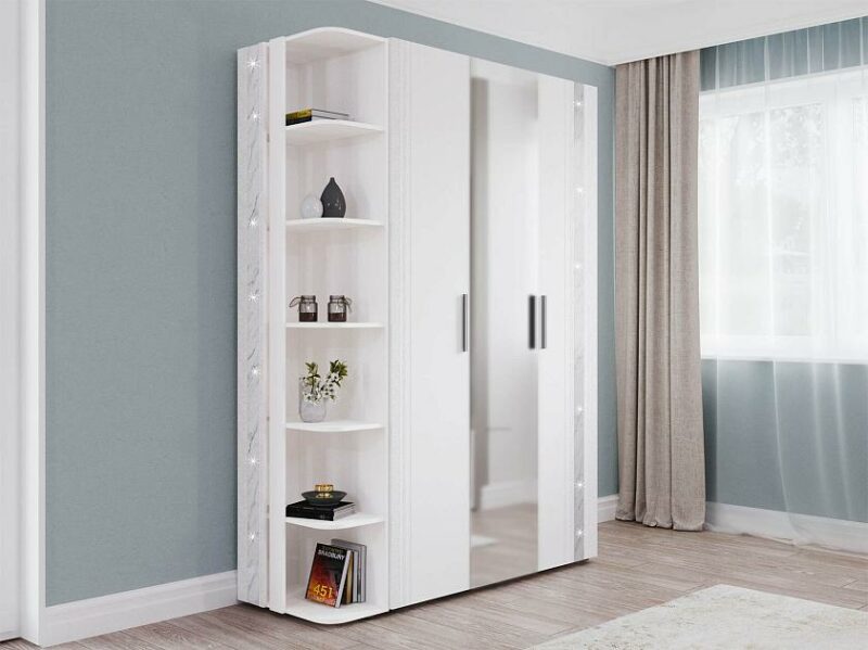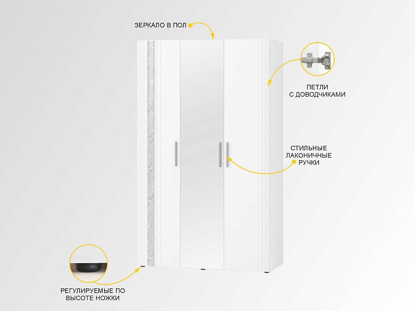 Шкаф трехдверный с зеркалом в комплекте «Николь 901 311» является частью модульной программы «Николь». Сочетание белоснежных матовых фасадов с нежно-серым мерцающим декором «мрамор» — визитная карточка этой коллекции.