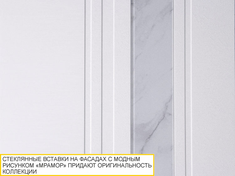 Фасады декорированы лаконичной фрезеровкой с объемным 3D-рисунком и стеклянными вставками из прочного осветленного стекла Crystal с рисунком «мрамор».