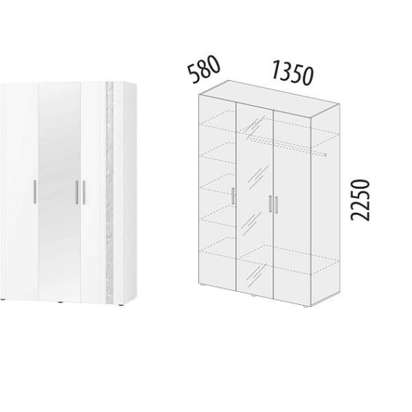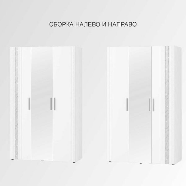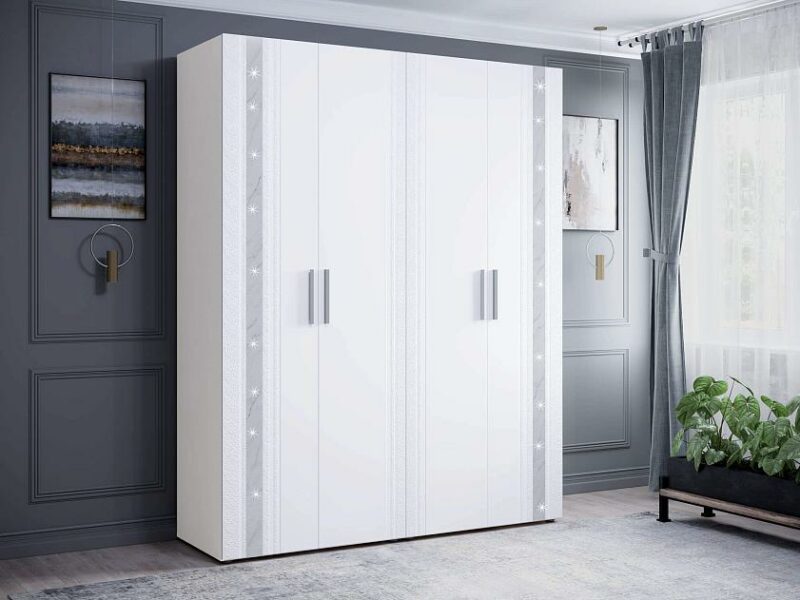 Шкаф четырехдверный в комплекте «Николь 901 312» является частью модульной программы «Николь». Сочетание белоснежных матовых фасадов с нежно-серым мерцающим декором «мрамор» — визитная карточка этой коллекции. Конструктив и дизайн модели продуман до мелочей.