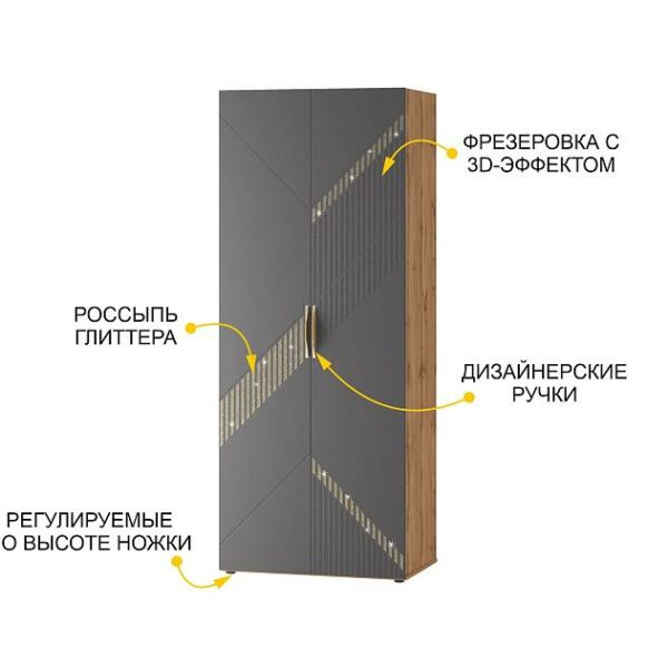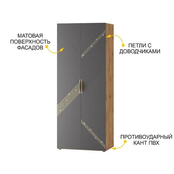 Дверцы шкафа выполнены из МДФ толщиной 16 мм, корпус — из ЛДСП толщиной 16 мм.