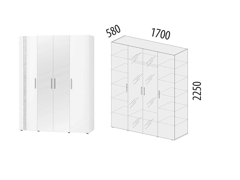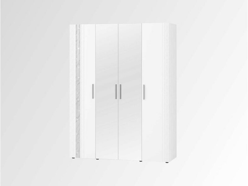 Шкаф четырехдверный с зеркалом «Николь 901.14» является частью модульной программы «Николь». Сочетание белоснежных матовых фасадов с нежно-серым мерцающим декором «мрамор» — визитная карточка этой коллекции. Конструктив и дизайн модели продуман до мелочей.