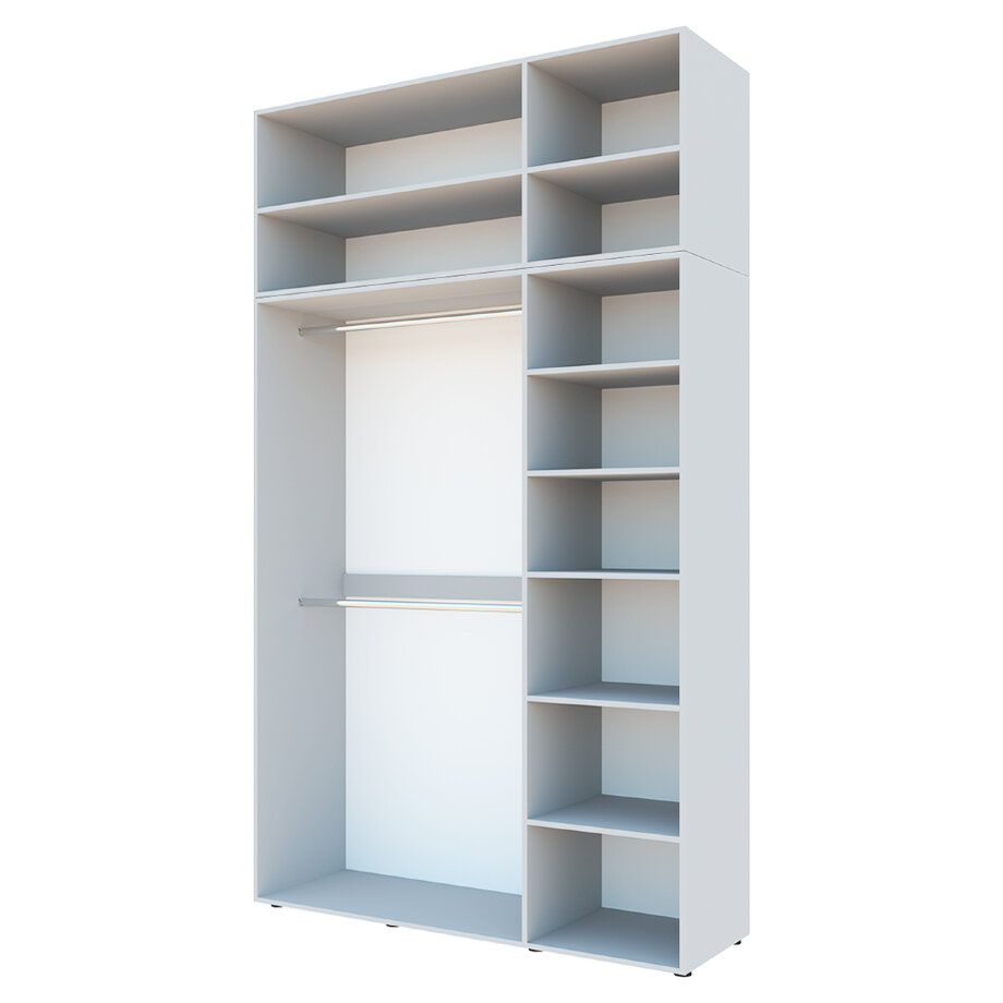 Шкаф может быть дополнен выдвижными ящиками, зеркалами, открытыми стеллажами и консолями, антресолями высотой 400 и 600 мм